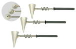 The JC Metal Sifters and JC Line & Dot Applicators. These tools dispense frit, powdered glass and enamels by shaking, tapping, or for the greatest control, by moving the Coil Actuator. It is incredibly easy to use. With just one hand, you hold the Sifter or Applicator and move the Coil Actuator forward and backward with either your finger or thumb. You easily control the volume of glass or enamel, from a gentle sprinkle to a heavy flow, by the pressure applied and the speed you move the Coil Actuator. The standard screen mesh size for the sifters is 60. This gives good flow, yet also gives you great control for shading. A 60 mesh screen is generally preferred for its ability for shading as well as its ability to efficiently cover a small item, such as a bead, quickly. We also offer all the Sifters in a 40 mesh screen. You may be familiar with this size, as that is what is in the red plastic bodied sifters. Enamellists also like the 40 mesh screen for its ability to cover a large area quickly and thoroughly. The two largest sizes are not pictured. Sifters Size Chart. |