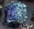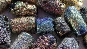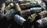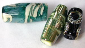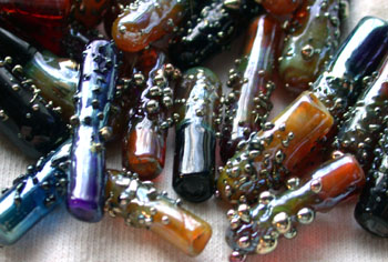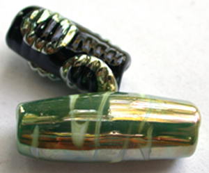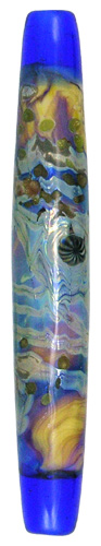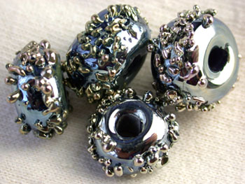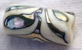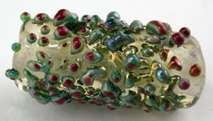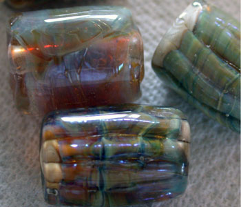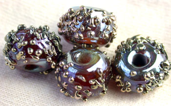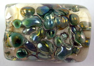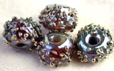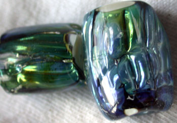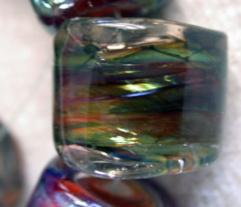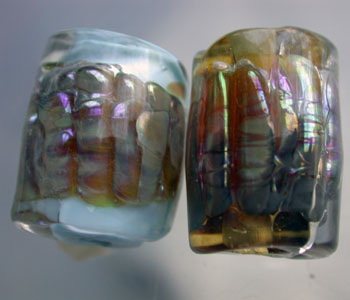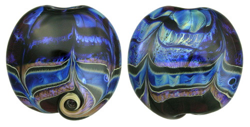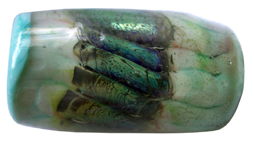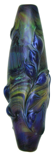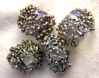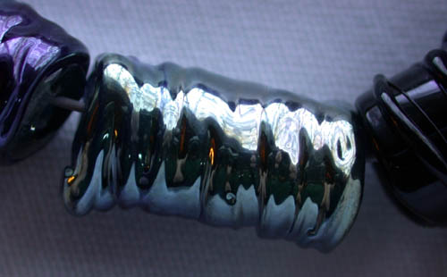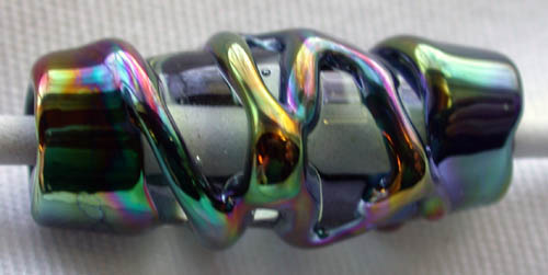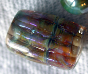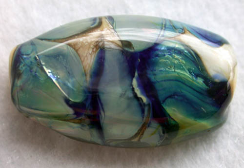 4 Encased Moody Blue - Follow any of the steps above and then let the bead cool with no glow left. More of the shiny iridescence will be preserved if you can "lop" on the clear without adding too much heat to the bead until you are ready to do the final shaping. Really interesting effects are achieved by using texture tools in the Moody Blue before reducing it and then encasing it. The shiny iridescence is hard to photograph, but it will look similar to this when encased: