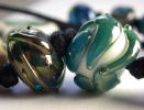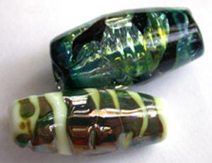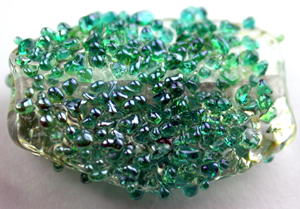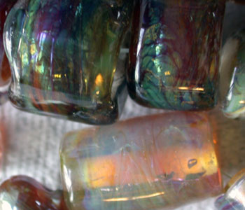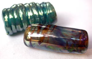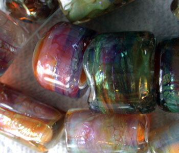 Teal-icious is a reducing transparent teal colored glass that will go through a range of colors depending on the reduction flame you use and time spent in the flame. With slight reduction you can get a rainbow or oil on water look. Full reduction (or dragons' breath flame) produces a bright silver very fast, longer in the flame produces a warm, bright gold and still longer you can get coppery reds. The iridescence holds up well after encasing, although too much heat will bring it back to its original teal color. Teal-icious is very easy to reduce and fun to play with. Available in rod and frit. For pictures see below: Techniques for using BellaDonna Glass.