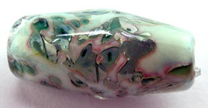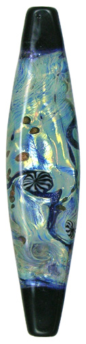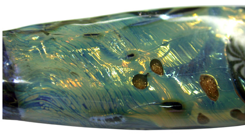Aqua Splash is a beautiful blue green glass containing silver that reduces to bring up amazing lusters; from subtle, transparent golds and silvers to opaque creamy gold. To produce a transparent luster, work the glass in a neutral flame and quickly apply a dragon's breath reduction flame as the final step before annealing. To produce an opaque creamy gold luster, work the glass for a longer time in any type of reduction flame.