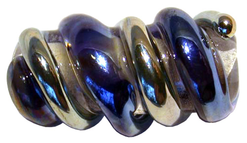 1 Silver – After all of your shaping is done, the last thing to do is to turn the parts of the bead with Moody Blue on it silver. What works best here is to briefly heat the Moody Blue to a dull orange glow and then bathe it in the purple part of the dragon's breath flame until you see the shine come up on the bead. Anneal in the normal way.