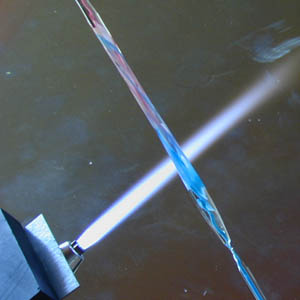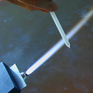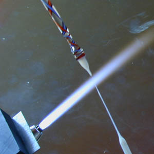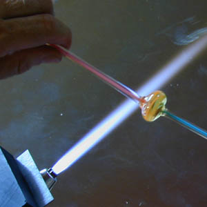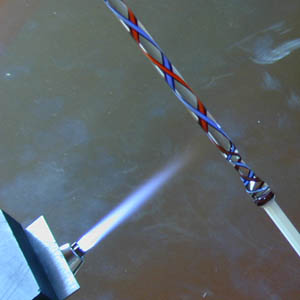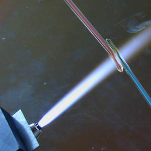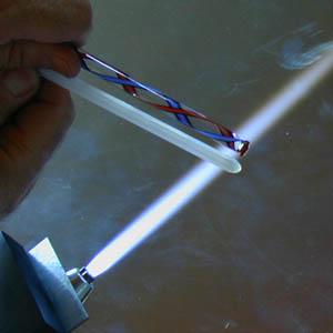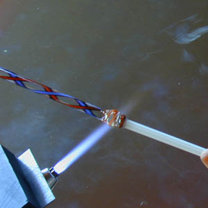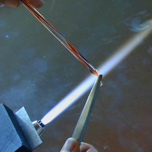 Start by pulling off the end of the cane to a symmetrical point with tweezers. This removes the sharp edge that can cause scum, straightens the pattern on the cane and prepares it for the next step. Large diameter candy cane rods are thermal shock sensitive. Heat them very slowly.
