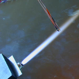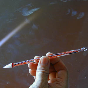 Remove the glass from the flame and pull at either side of the heated area to create the tapered nib. If the area being heated is very narrow, the nib will be short and not very tapered. If the area being heated is too wide, the nib will be very long and narrowly tapered and also more delicate and susceptible to breakage. You can put a twist in the nib glass as you pull it. Remember to use a very gentle heat to prevent the ribs from melting away. As the point forms, pull quickly to bring it to a fine point. The left over nib glass can be burned off away from where the nib tip will be. The actual tip of the nib is created by snapping it off at the desired location. If you try to create the finished nib tip in the flame, it will not flow the ink properly. The smaller you pull the point, the finer the line the pen will write. Creating the nib is the most critical and hardest part of making the pen. You will need to practice this step several times.