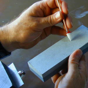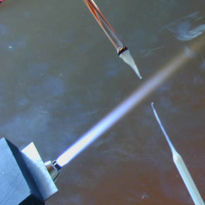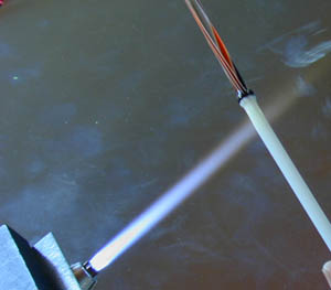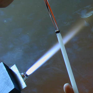 Return the flame to neutral. Working near the flame tip, gently heat the nib glass. It is very important to continuously and smoothly rotate the glass to insure an evenly tapered nib. If you heat the glass too hot or for too long, the nib ribs will melt away and the pen will not be able to hold ink.